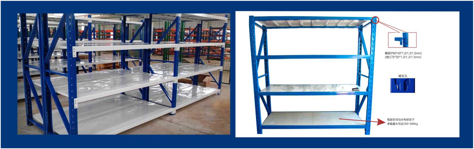 柱片采用焊接式結構(更增加了穩定性),立柱為75*35*0.8/1.0/1.2/1.5mm,孔型為蝶形孔。橫梁P60*40*0.8/1.0/1.2/1.5mm,層板采用0.4~0.8mm鋼層板,相比中量B型貨架,材料厚度薄,貨架的自重更輕,成本相對更低。層高每75mm任意可調。 |