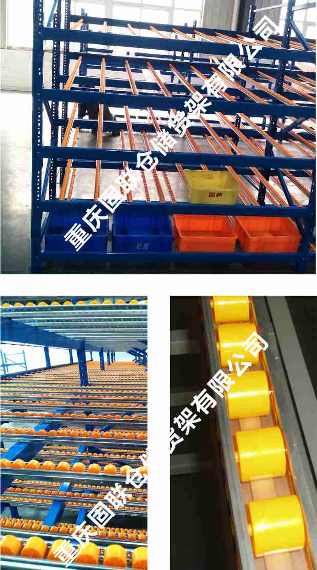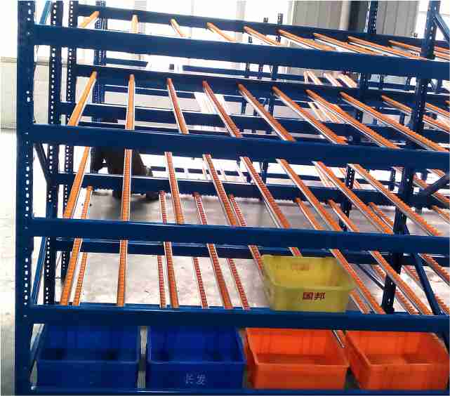滾輪式料架簡稱流利架,是將貨物置于滾輪上,利用一邊通道存貨,另一邊通道取貨。料架朝出貨方向向下傾斜,貨物在重力作用下向下滑動。可實(shí)現(xiàn)先進(jìn)先出,并可實(shí)現(xiàn)一次補(bǔ)貨,多次揀貨。流利架存儲效率高,適合大量貨物的短期存放。